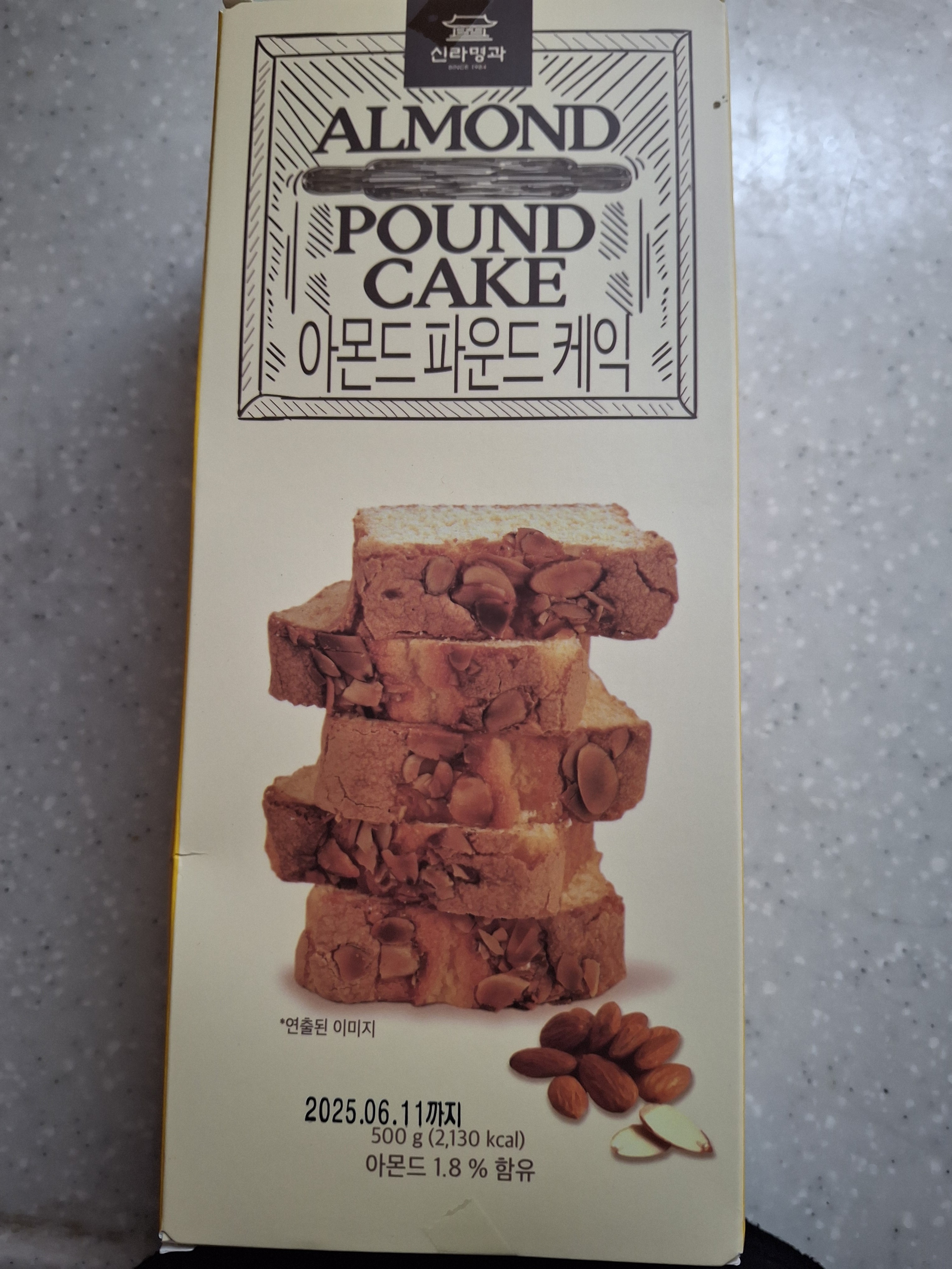 아몬도포함 신라명과 파운드케익에는 고소한 아몬드가 포함되어 있습니다.파운드 케익은 고급 디저트로써 손님 접대용으로도 손색이 없고 친구 및 지인집에 방문할때 선물용으로 가져가도 너무 좋은 제빵류 입니다.신라명과 파운드케익을 좋아하는 이유는 촘촘하게 빡빡한 케익의 느낌을 좋아해서 신라명과 파운드 케익을 좋아하고 자주 구매합니다.추가로 스콘도 좋아합니다.