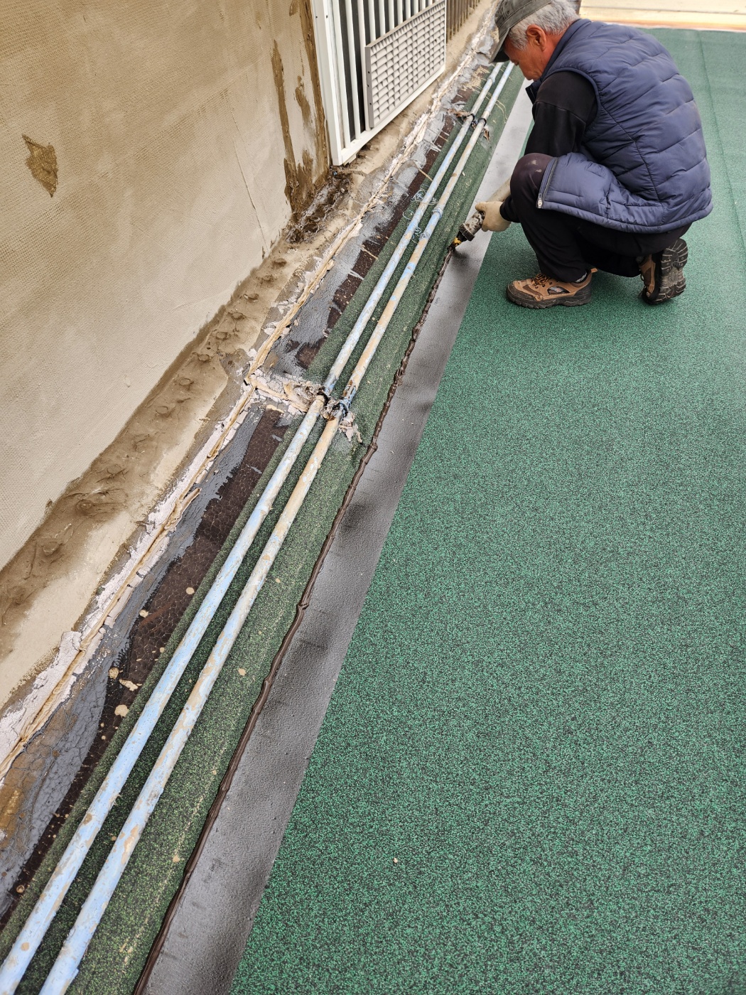 실리콘 마감 작업 벽면과 샌드위치판넬 마감부분 롤아스팔트슁글 마감부분에는 실리콘을 두껍게 도포하여 마감처리 작업을 진행합니다.최대한 실리콘을 두껍게 도포하고 해라 밀대 장비로 말끔히 처리하여야 날씨 온도에 이래서 실리콘이 수축 팽창되어 방수층이 깨지거나 소멸되는 문제가 발생하지 않습니다.