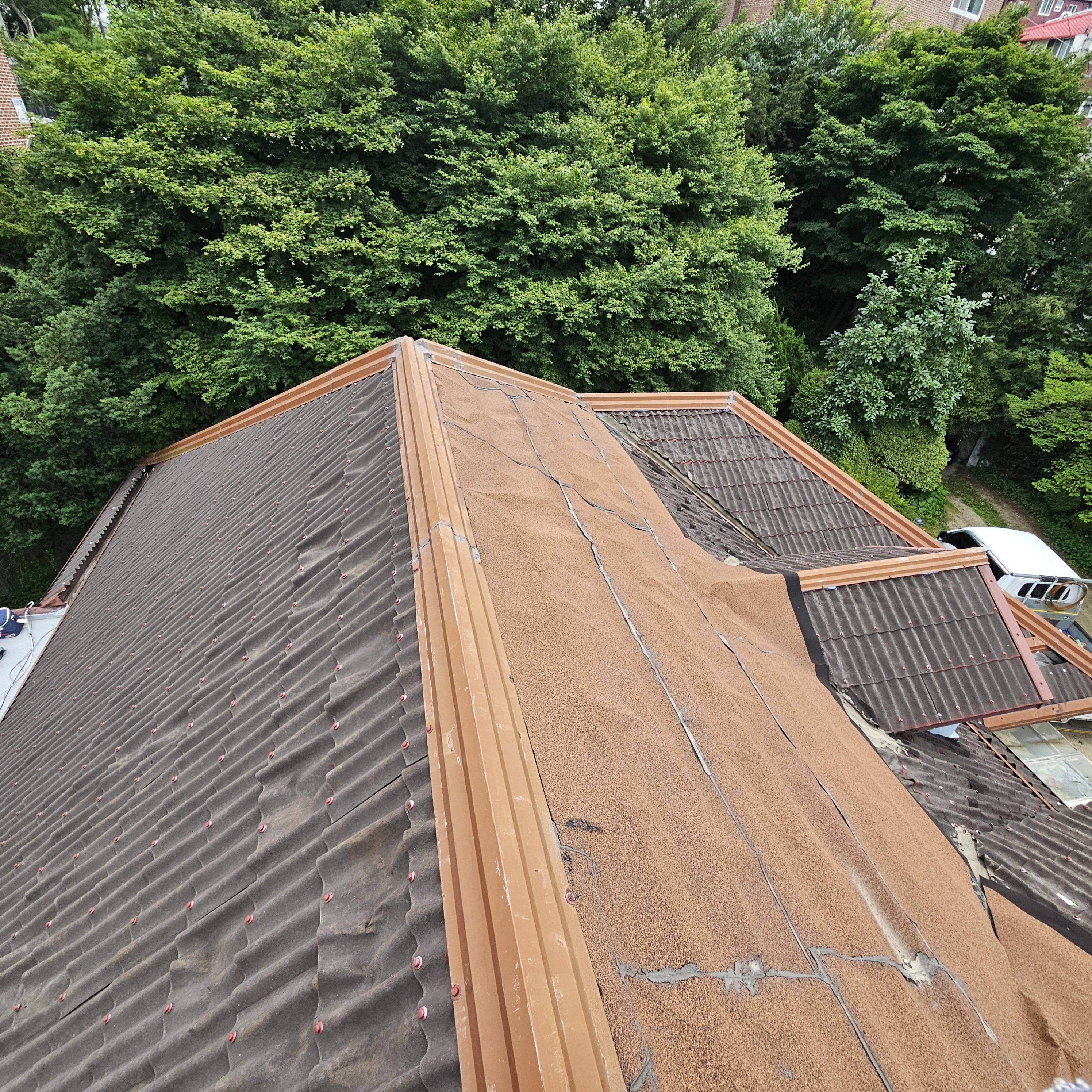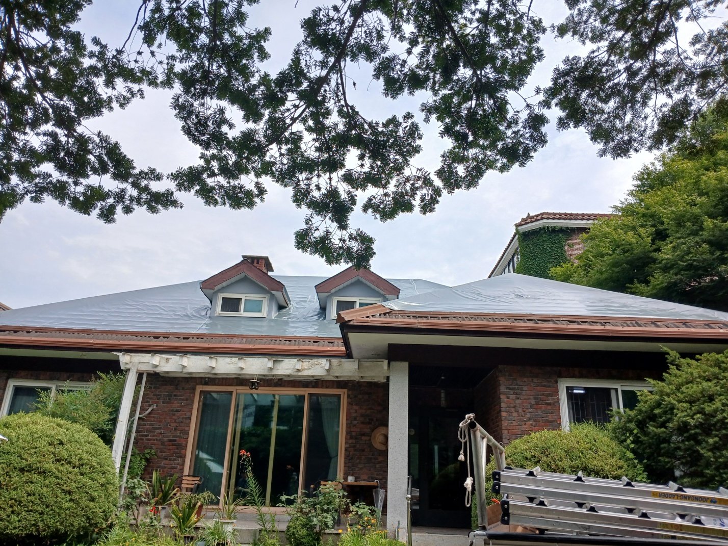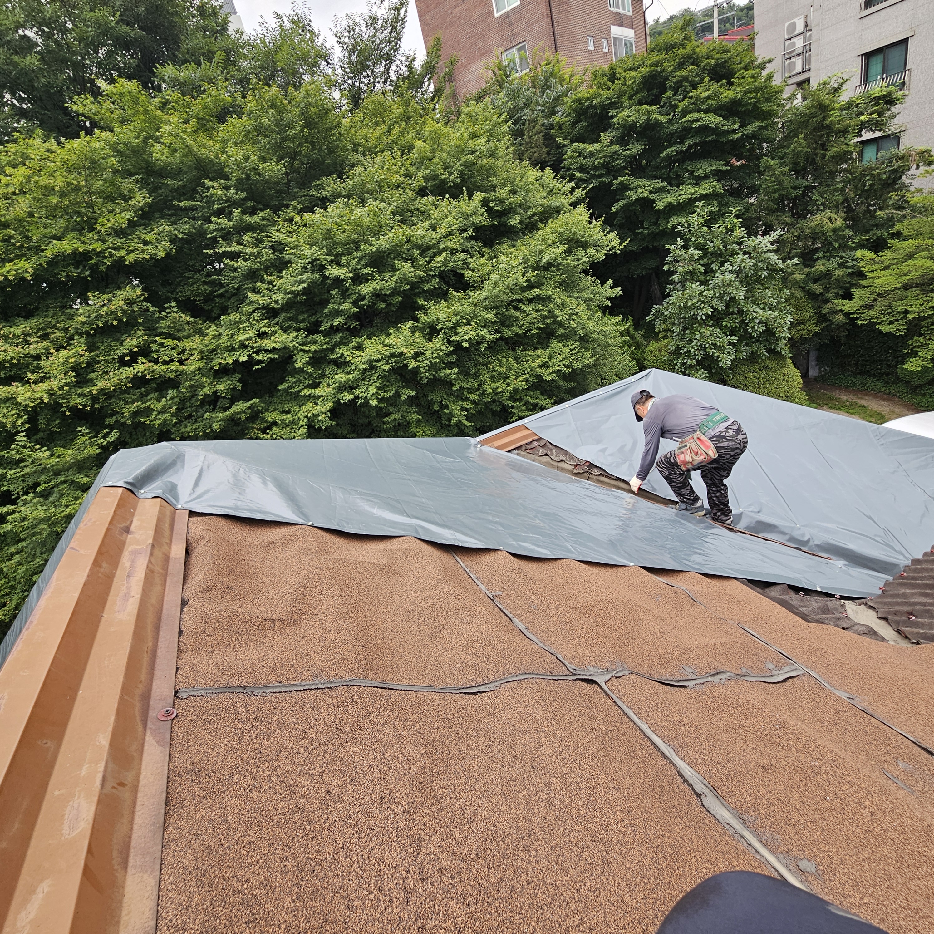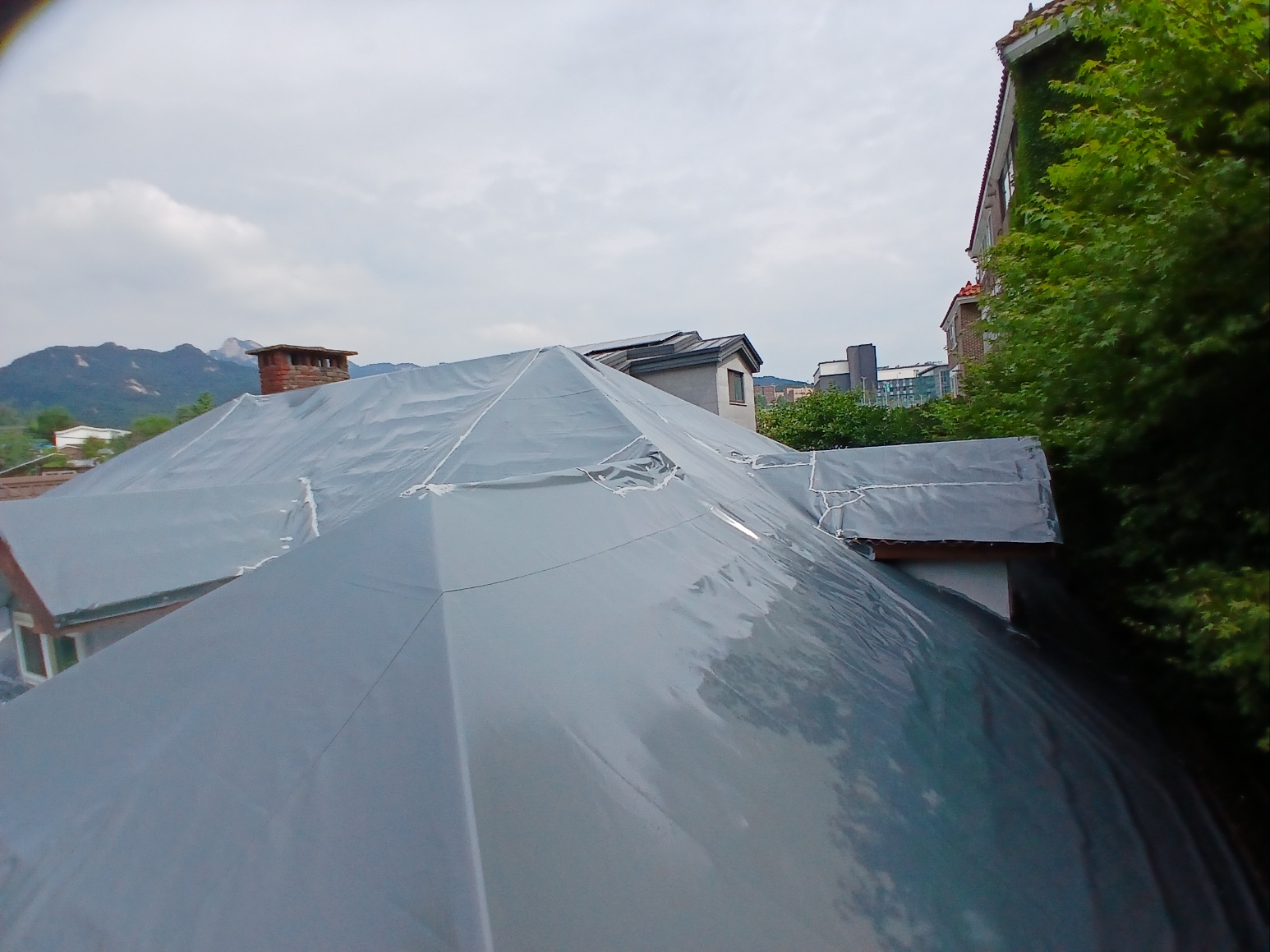 안녕하세요 금일 소개하여드릴 현장은 성북구 정릉동에 위치한 주택입니다.비가오면 지붕에서 누수가 발생하여 롤아스팔트슁글 지붕자재를 사용하여 부분적으로 지붕방수 작업을 진행한 흔적도 남아있습니다.2025년 장마기간 극한폭우가 내리면서 또다시 지붕누수가 발생하여 지붕을 덮어서 방수층을 만들어주는 타포린방수포 방수천막 지붕공사 지붕수리 작업을 요청해주셨읍니다.