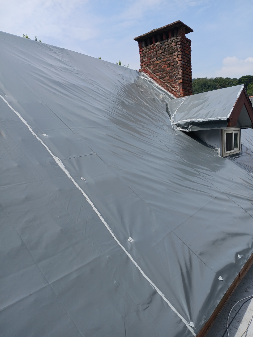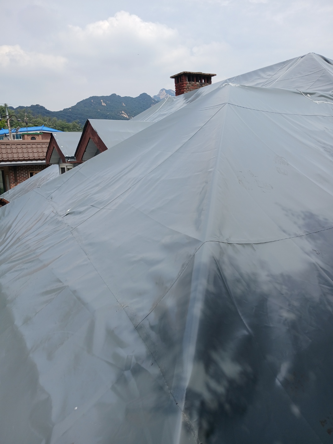 타포린방수포 시공 타포린방수포 방수천막을 가공하여 지붕 전체구역에 덮으면 지붕안쪽으로 빗물이 침투하거나 스며들지 못하게되어 지붕누수가 차단이되는것입니다.부분적 시공도 가능하오나 지붕 전체 구역에 타포린방수천막 시공하는것이 지붕을 하나의 방수층으로 만들어주고 많은 비가 내려도 지붕에 빗물이 스며들지 않습니다.