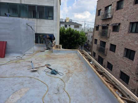 옥탑 벽 마감처리 옥탑벽면과 지붕이 맞다는 마감 부분에는 맞춤카바를 시공하여 빗물이 지붕안쪽으로 스며들지 않도록 마감처리를 진행합니다.카바 시공후에 실리콘을 두껍고 넉넉하게 도포하여 실리콘 방수층이 파손되지 않도록 마감처리 작업을 진행하였습니다.