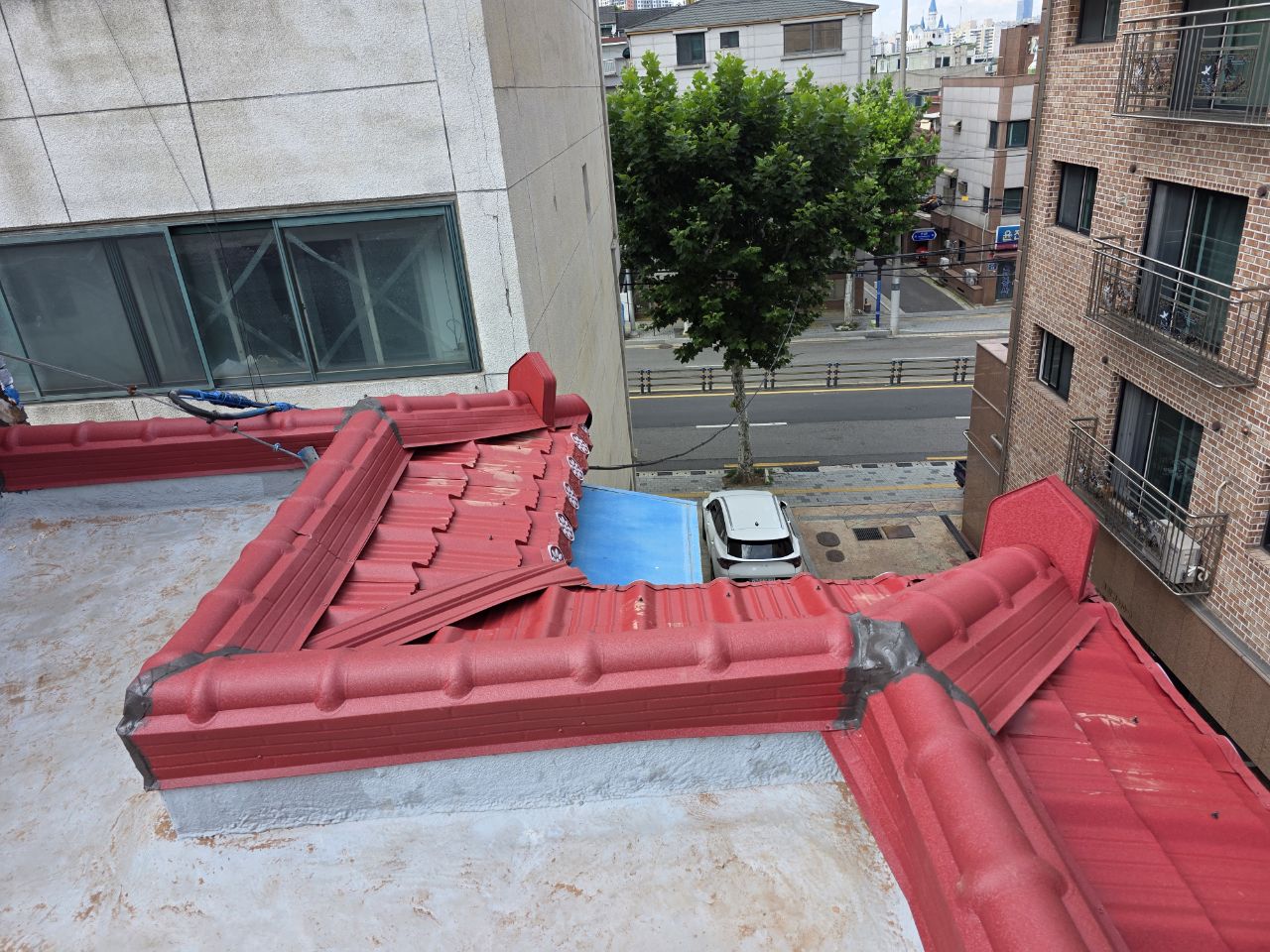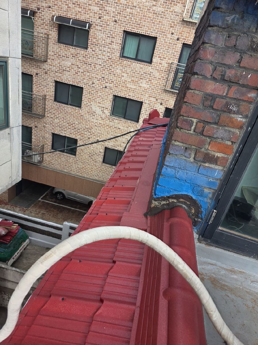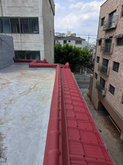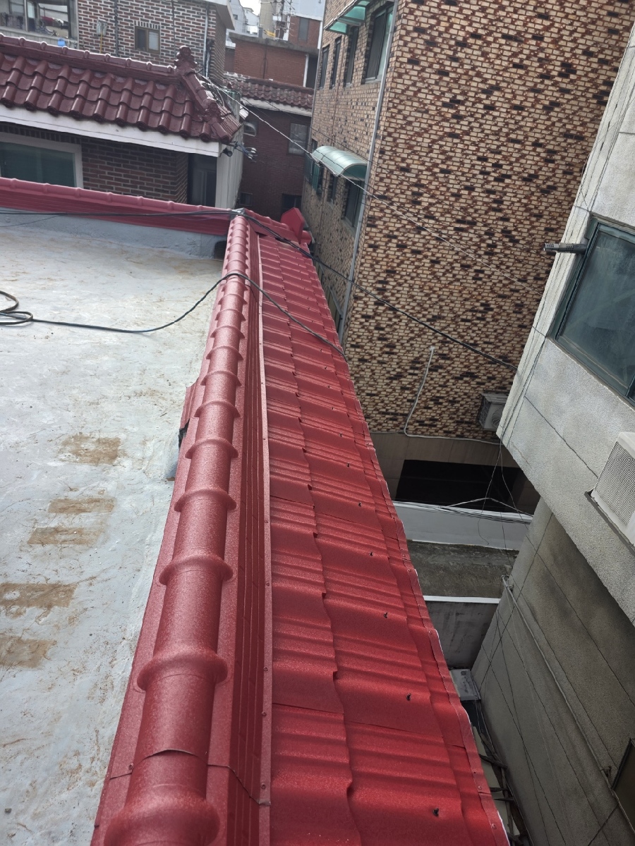 안녕하세요 금일 소개하여드릴 현장은 금천구 독산동에 위치한 주택 옥상 입니다.옥상 난간에 설치된 시멘트기와가 추락 이탈되는 문제가 발생하여 기와를 모두철거하고 칼라강판 지붕공사를 진행하였습니다.