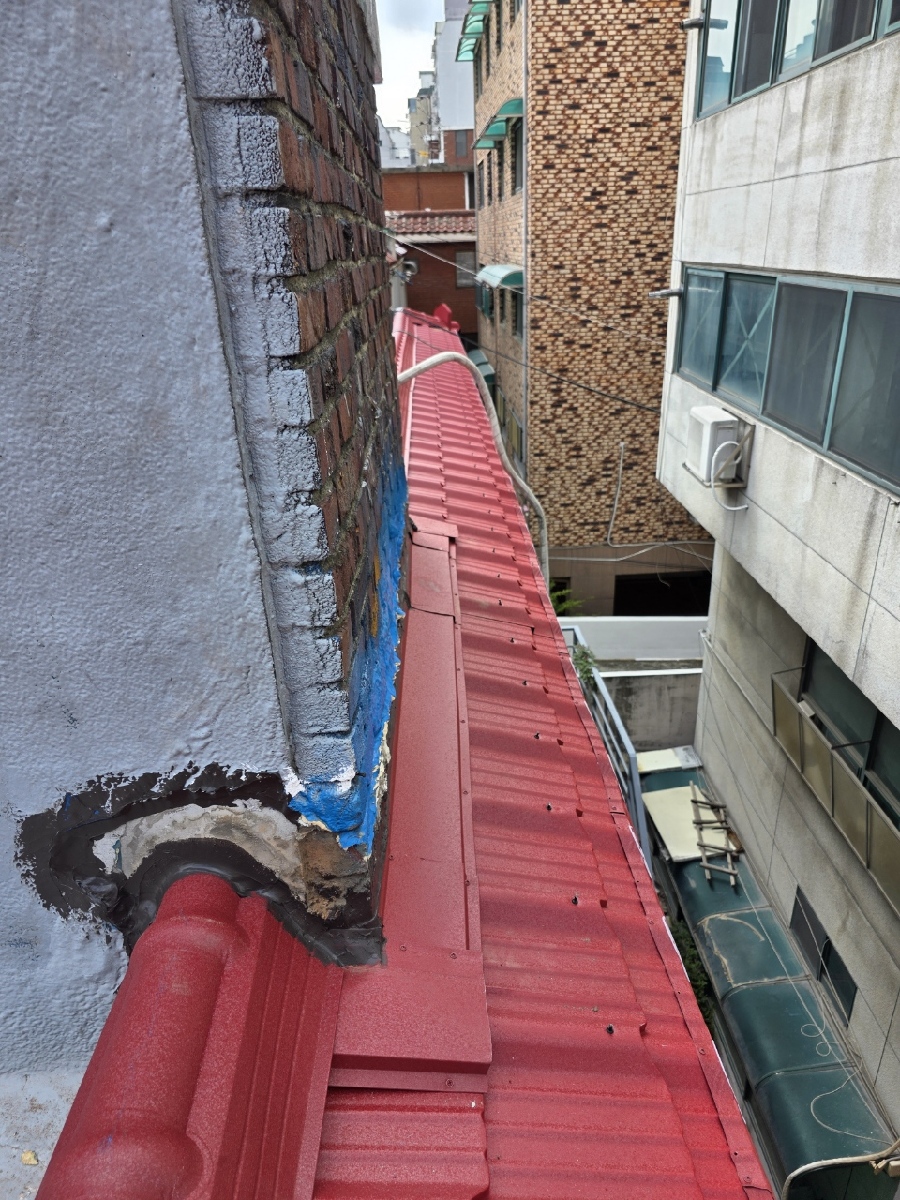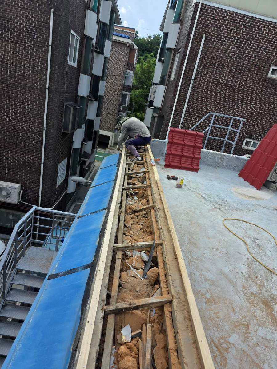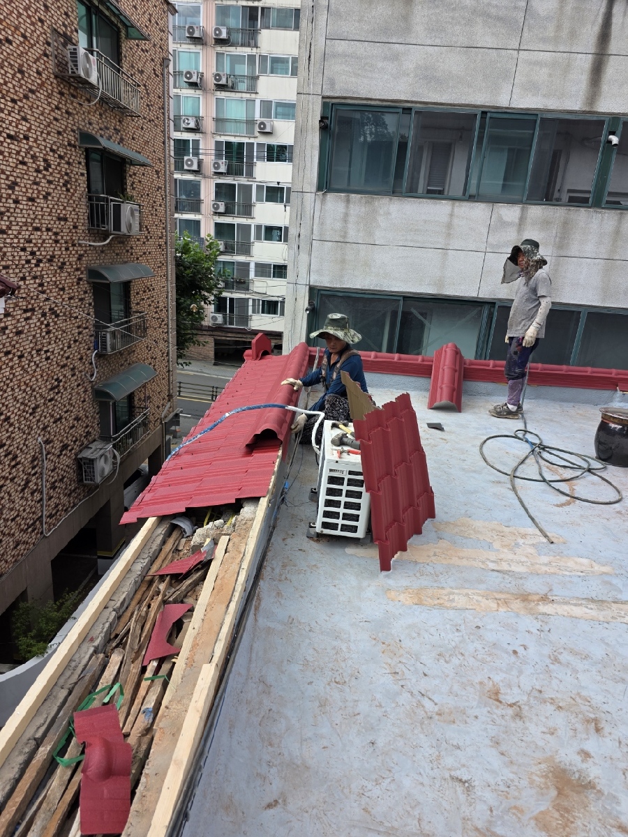 안녕하세요 금일 소개하여드릴 현장은 금천구 독산동에 위치한 주택 옥상 입니다.옥상 난간에 설치된 시멘트기와가 추락 이탈되는 문제가 발생하여 기와를 모두철거하고 칼라강판 지붕공사를 진행하였습니다.