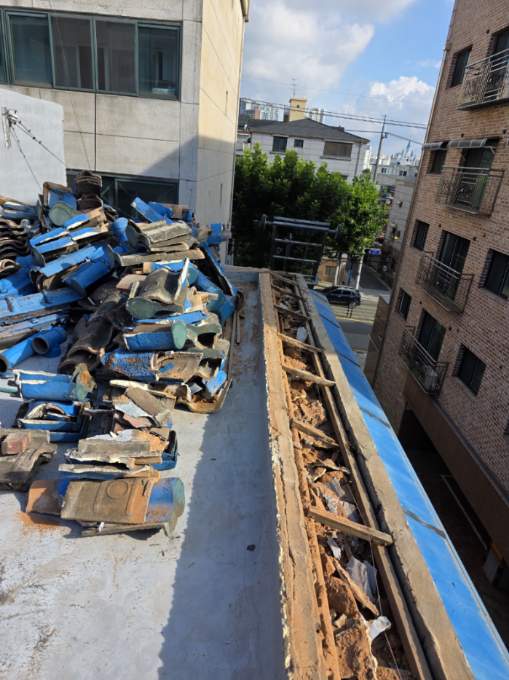 기와철거 폐기물 처리 옥상 난간에 설치된 시멘트기와를 철거하고 철거한 기와는 현장 상태에 따라 고객님과 협의후에 지붕안쪽에 매립을 하기도 합니다.폐기물 처리 비용을 절약하기 위해서도 매립후 칼라강판 지붕공사 작업을 진행하기도 합니다.