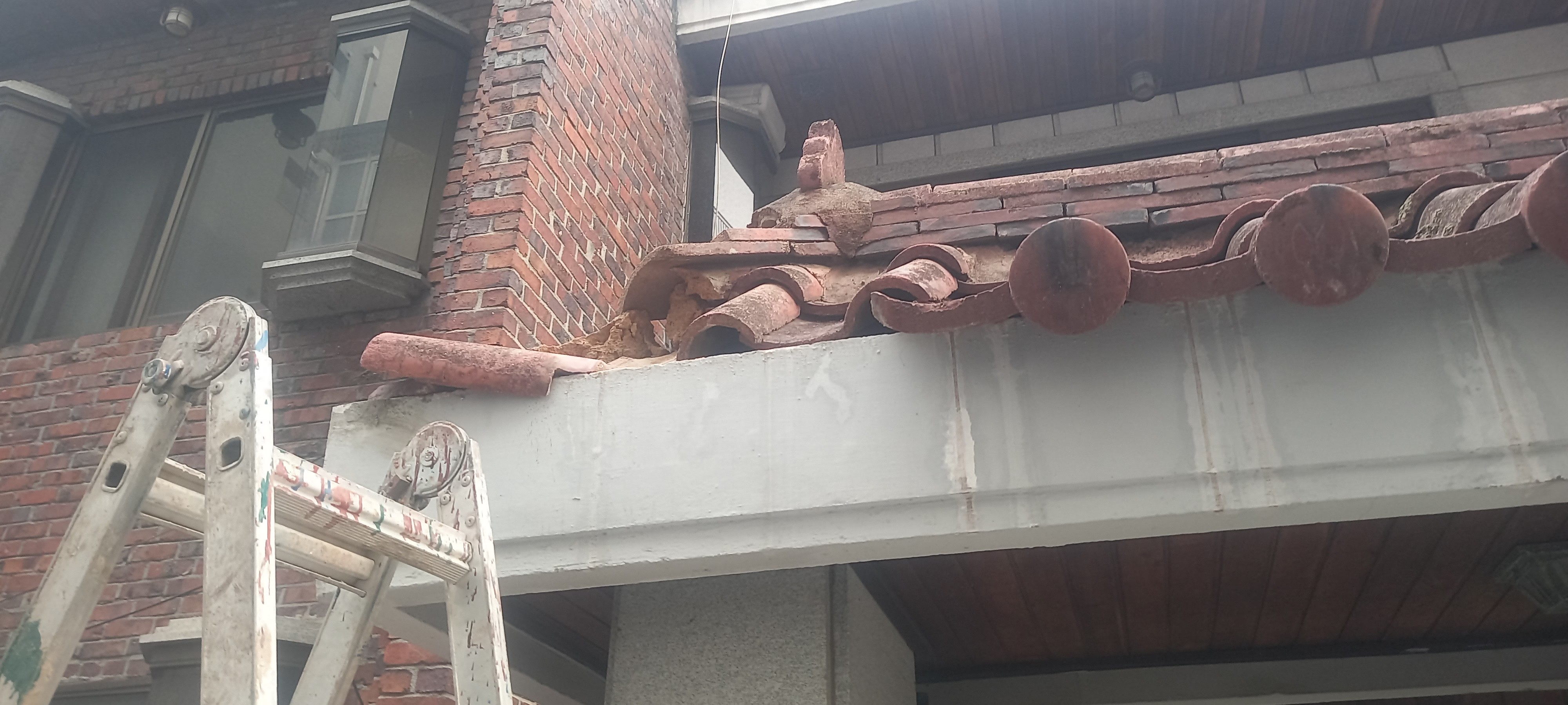 담장기와 파손 대문에 설치된 기와가 파손되면서 담장에 설치된 기와부분으로 파편이 추락하여 같이 파손된 모습입니다.담장 기와도 파손되거나 깨진 기와를 제거하고 기와를 뜯어낸후 기와재잇기 작업을 진행하여 원래 담장기와 모습으로 복원하는 작업을 진행하게 됩니다.