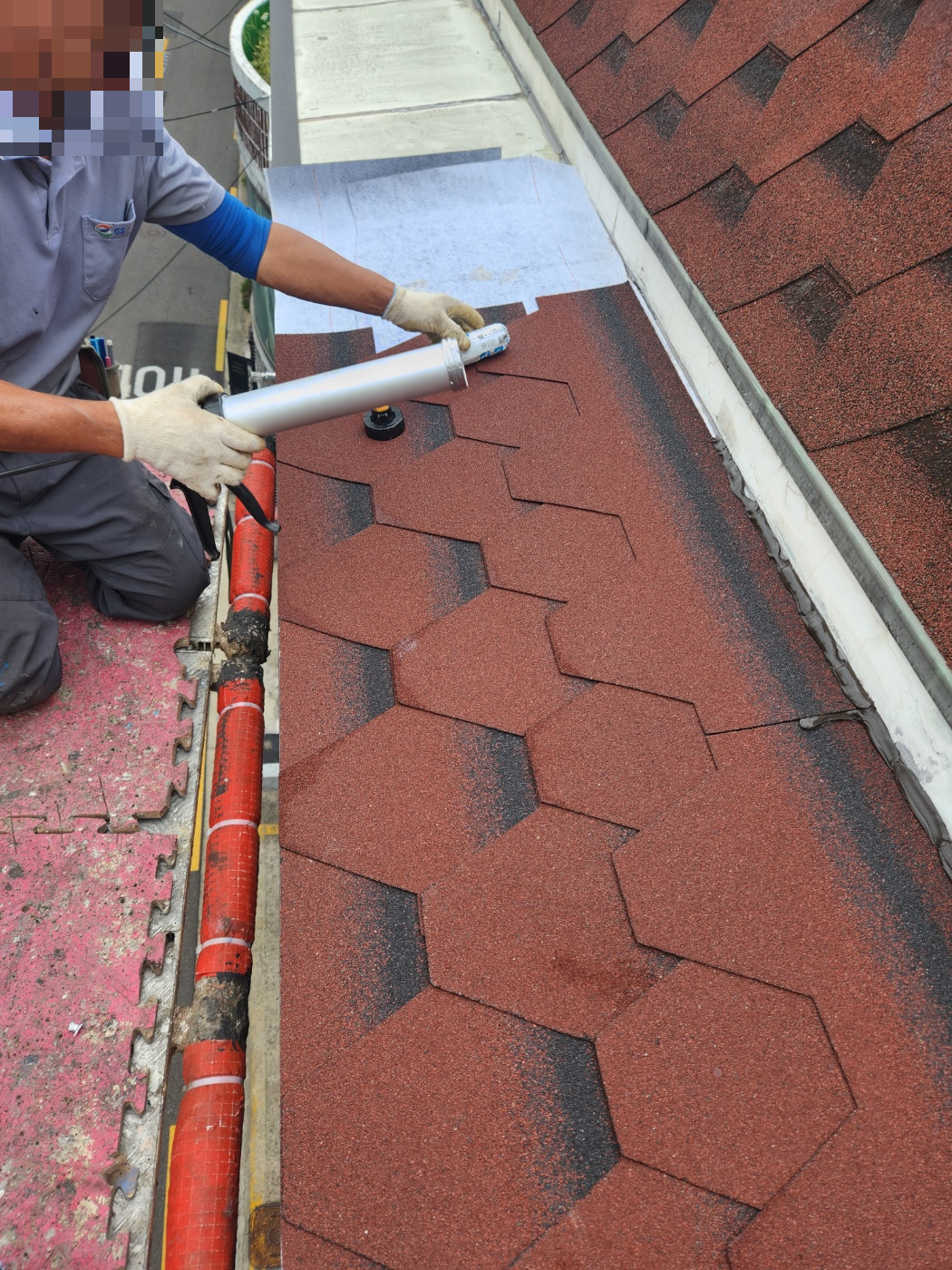 실리콘 마감 작업 방수시트 및 아스팔트슁글 설치 지붕공사 작업후에 실리콘을 두껍고 넉넉하게 도포하고 해라 및 밀대 장비를 사용하여 말끔하게 처리하면 실리콘 방수층이 오랫동안 문제없이 파괴되지 않고 유지가 됩니다.이렇게 해서 확장베란다 샌드위치판넬 지붕에 방수시트 및 아스팔트슁글 설치 지붕공사 작업이 완료되었습니다.지붕에 문제가 있으시면 언제든 무료상담이 가능합니다.감사합니다.