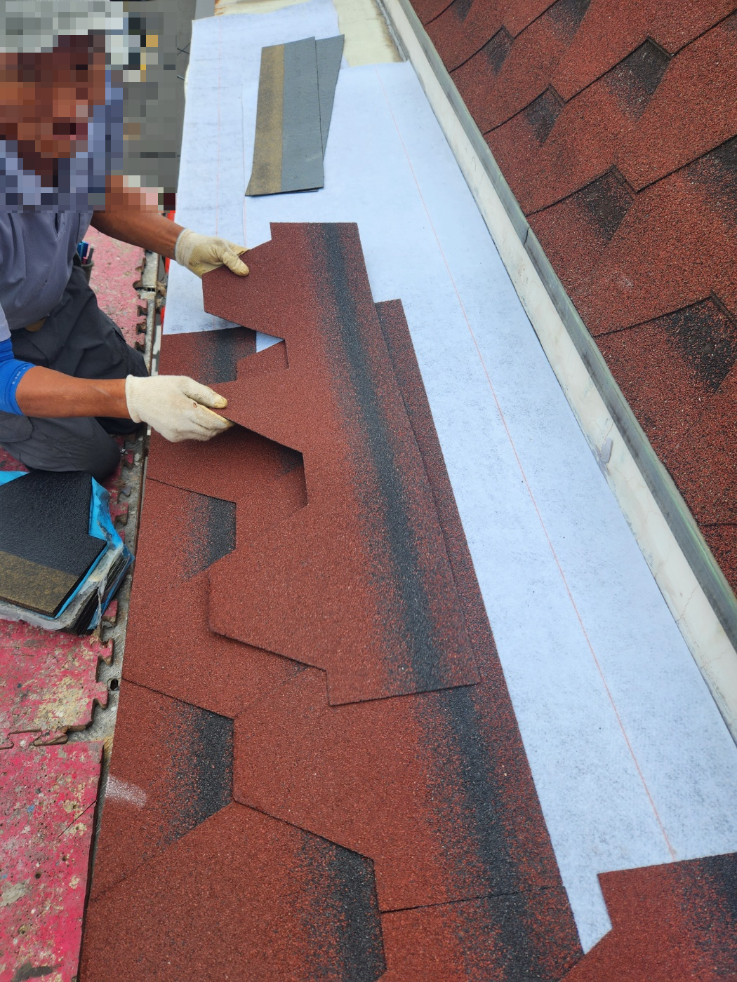 아스팔트슁글 설치 방수시트 설치 지붕공사 작업이 완료되면 육각아스팔트슁글 지붕바닥면에 붙이는 작업을 진행합니다.아스팔트슁글 및 방수시트 자재 안쪽부분에는 접착력이 강한 접착제가 도포되어 있어서 지붕바닥면에 달라붙으면 따뜻한 날씨에 접착제가 녹으면서 지붕바닥면에 부착되게 됩니다.