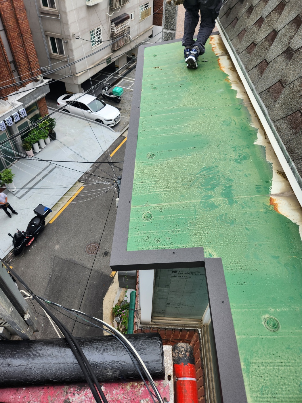 방수작업 하시면 안됨 금속형태의 지붕에 우레탄방수액을 도포하면 금속에 스며들지 못하고 달라붙지 못하게 되어 금속 겉표면에서 이탈 탈락 변질 문제가 발생하면서 방수층이 깨지게 됩니다.우레탄방수액은 시멘트 바닥면에 하도 중도 상도 3가지 방수액을 도포하여 방수층을 만드는 옥상방수 방법중 한가지 입니다.