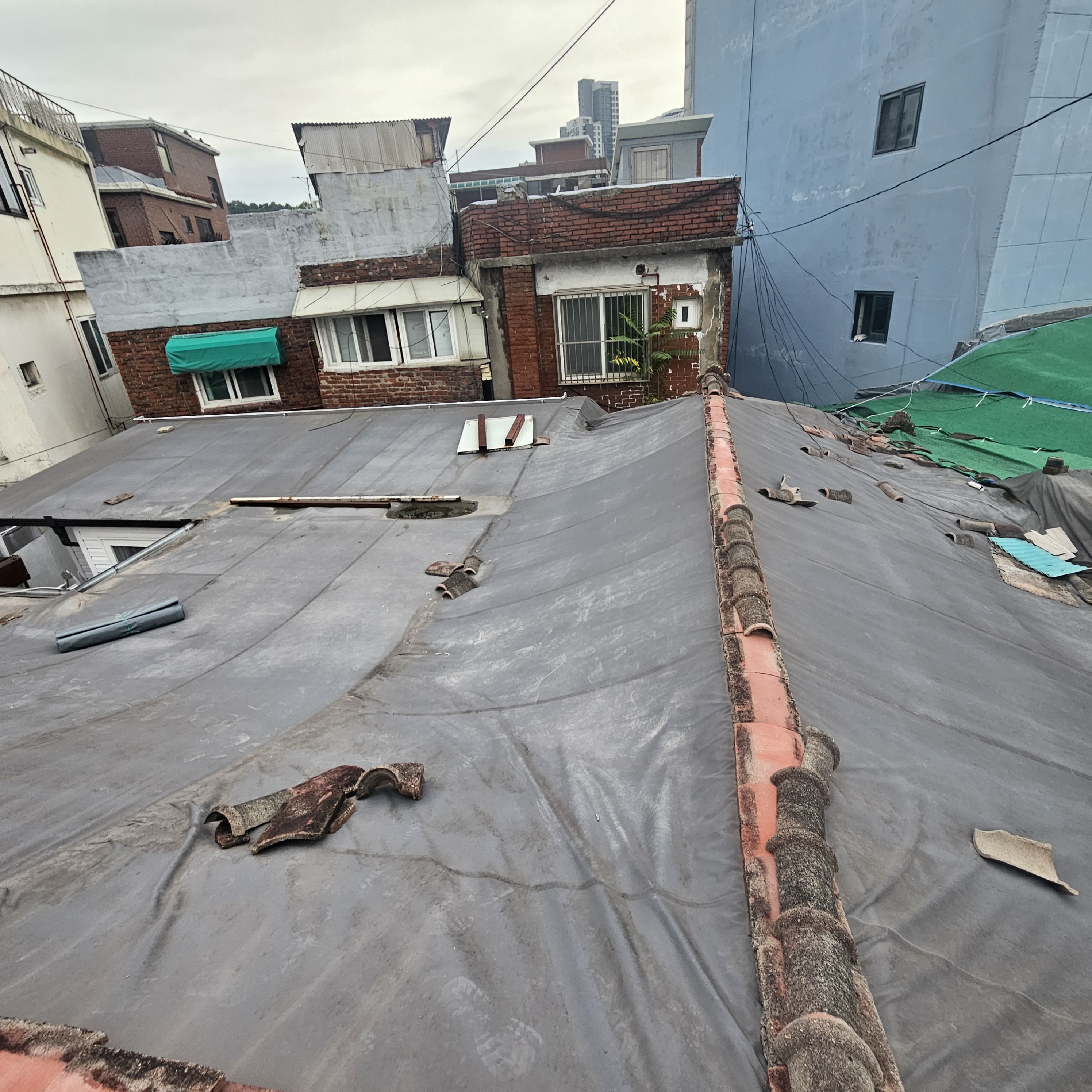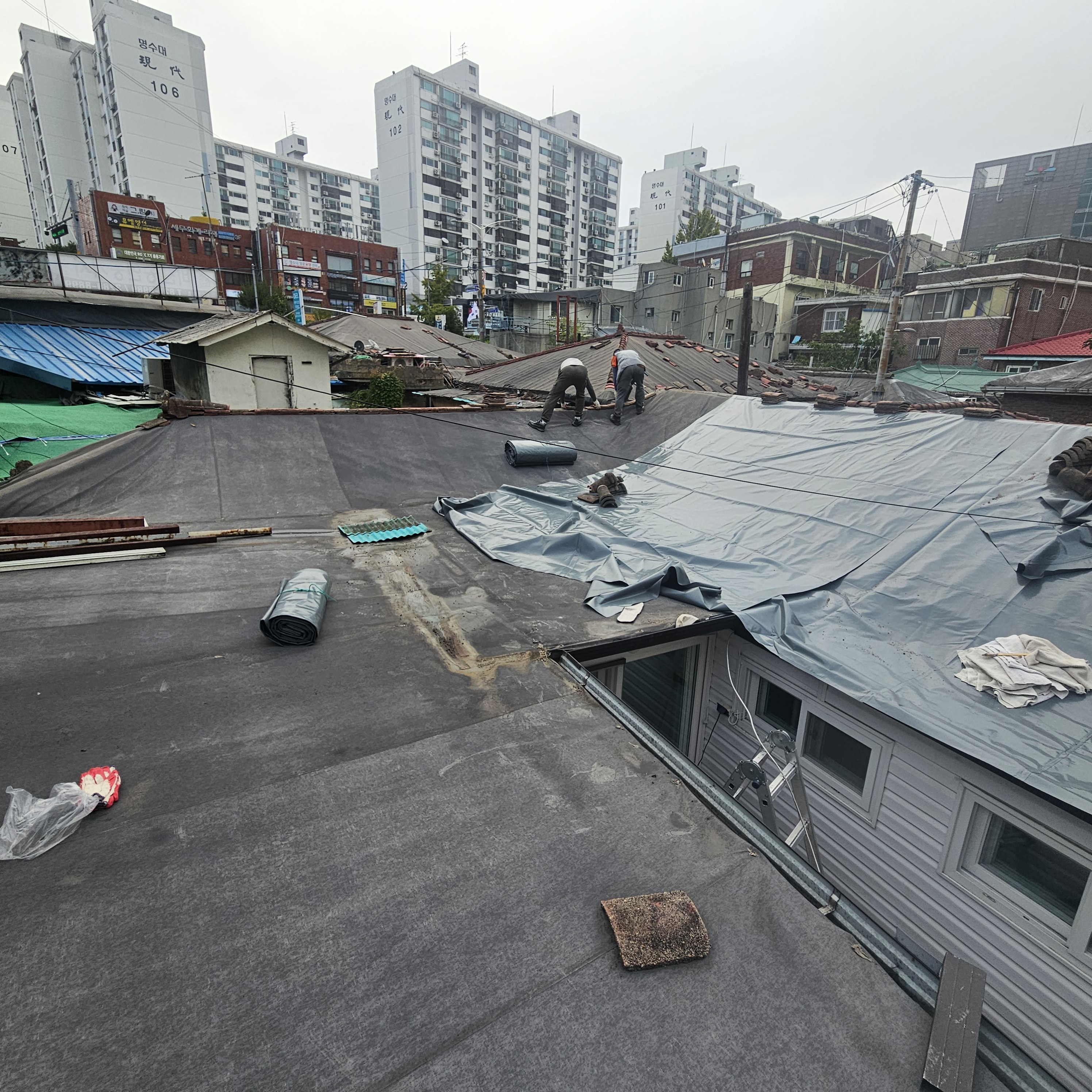 안녕하세요 금일 소개하여드릴 현장은 동작구 흑석동에 위치한 주택입니다.동작구 흑석동 지역은 재개발 이슈가 있는 구역이라 큰공사 금액을 들여서 지붕공사를 하시기에는 힘들다고 하셔서 공사금액대비 누수차단이 가장 잘되는 지붕방수 지붕공사 방법인 타포린방수포 방수천막 설치 작업을 해드렸읍니다.