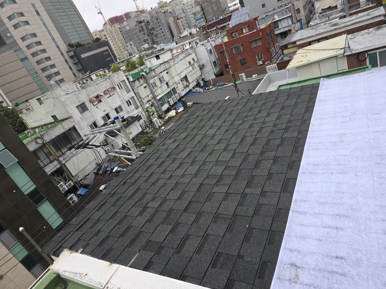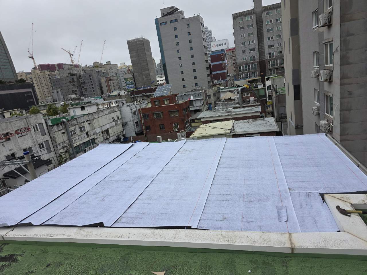 지붕 방수시트 시공 지붕 전체면에 방수시트를 설치하여 지붕을 하나의 방수층을 만들면 옥탑지붕 어느쪽으로라도 빗물이 침투하여도 지붕누수는 발생하지 않습니다.