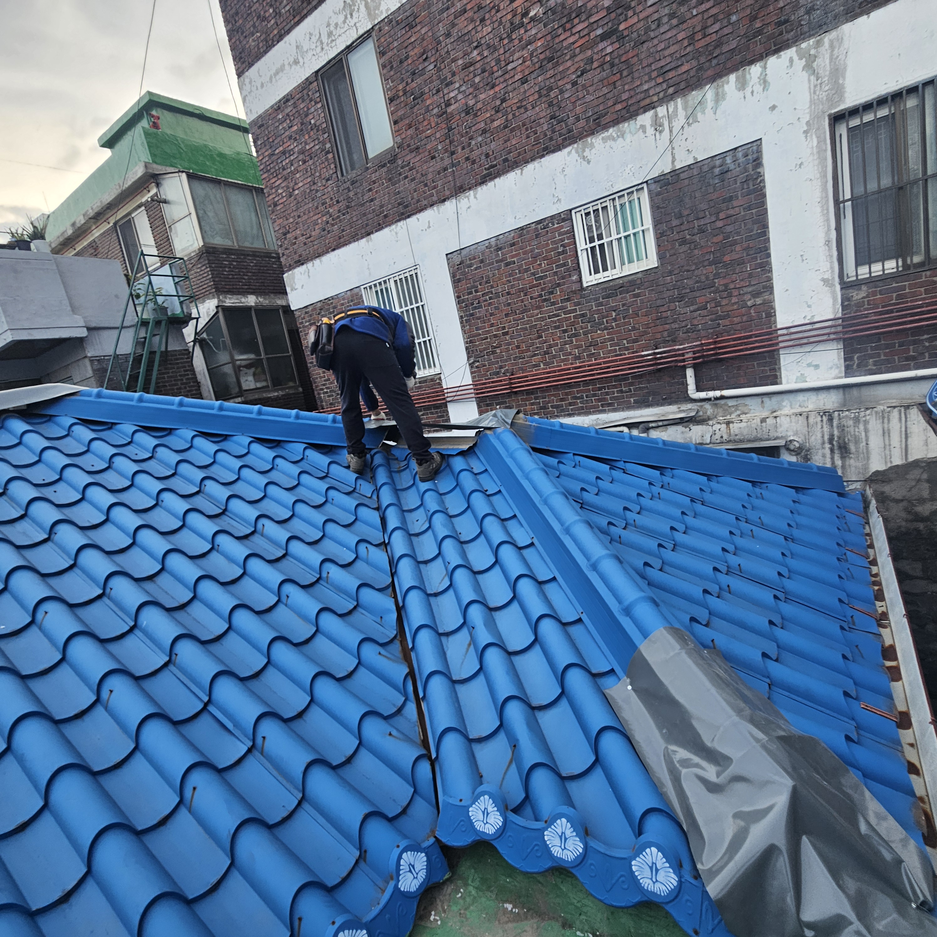 안녕하세요 금일 소개하여드릴 현장은 인천광역시 미추홀구 도화동에 위치한 주택입니다.지붕에 칼라강판이 시공되어진 상태인데 비가 많이오면 누수가 발생하여 여러번 수리를 받으셨지만 해결이 되지않아서 여러가지 방법을 찾아보시다가 지붕을 덮어서 누수를 차단하는 방법인 타포린방수포 방수천막 지붕방수 지붕공사 방법을 찾으시고 설치 작업의뢰를 해주셨읍니다.