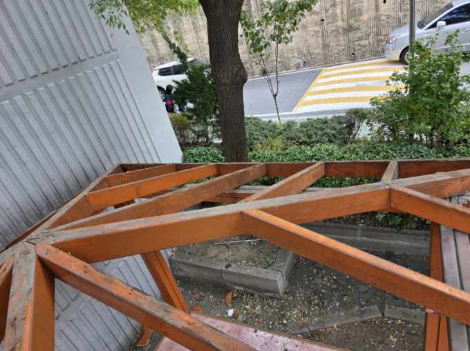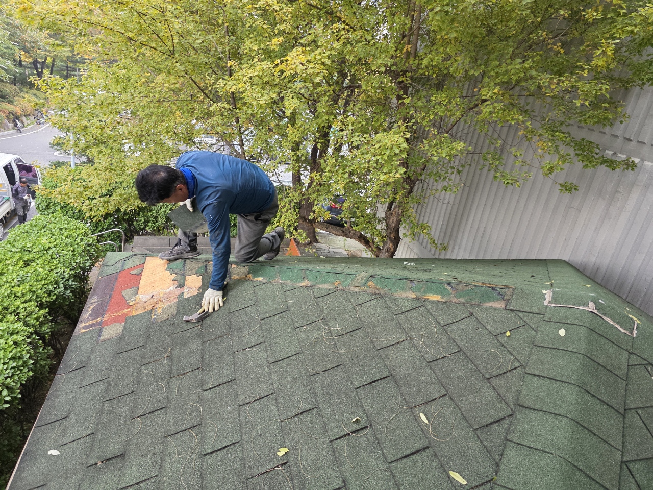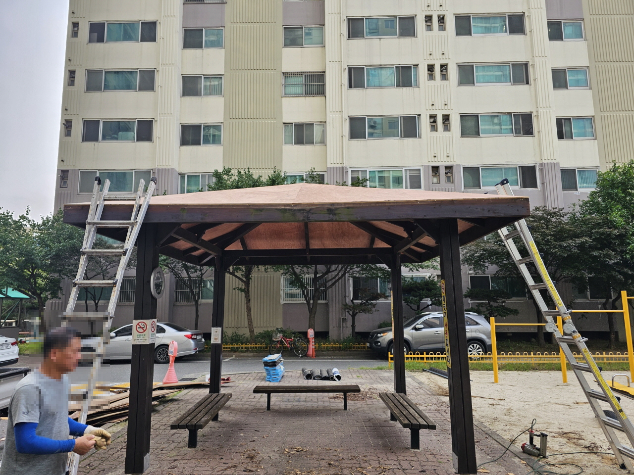 안녕하세요 금일 소개하여드릴 현장은 중랑구 면목동에 위치한 아파트 입니다.아파트쉼터에 설치된 정자 원두막 구조물 지붕에 설치된 아스팔트슁글이 노후되어 기존 지붕에 설치된 슁글 합판 후레슁을 모두 철거하고 새롭게 후레슁카바 방수시트 아스팔트슁글을 시공하였습니다.