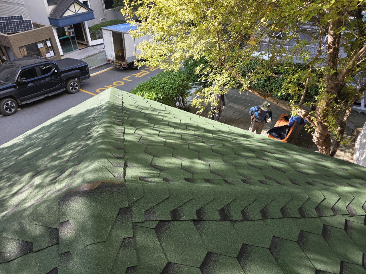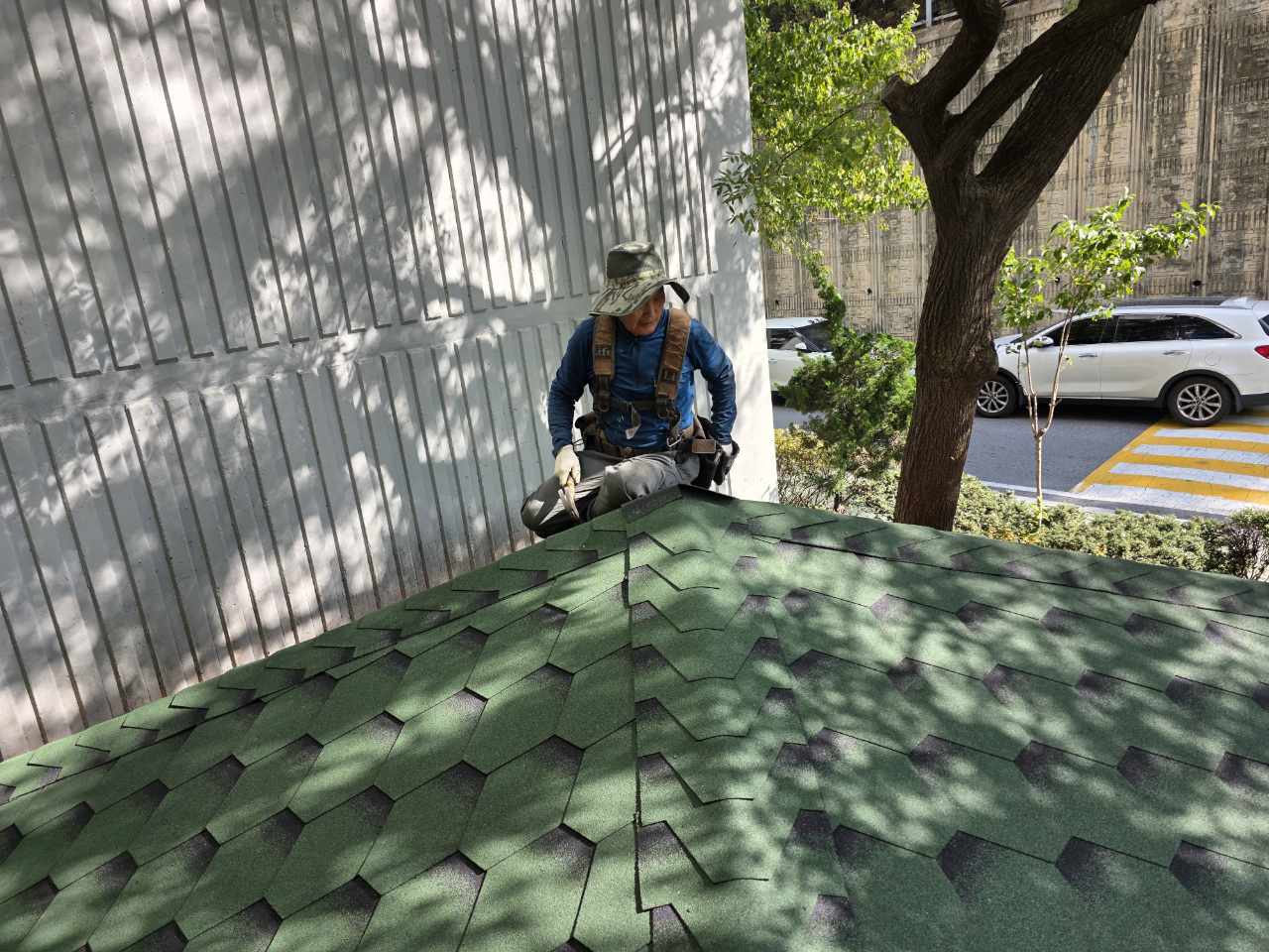 아스팔트슁글 설치 방수시트 설치 지붕공사 작업이 진행중입니다.아스팔트슁글을 한장씩 겹쳐서 지붕에 붙이고 전용못으로 한장식 고정하고 시공후 태양열에 몇일간 노출되면 강하게 지붕에 붙어서 강풍이 불어도 절대로 쉽게 떨어지지 않습니다.