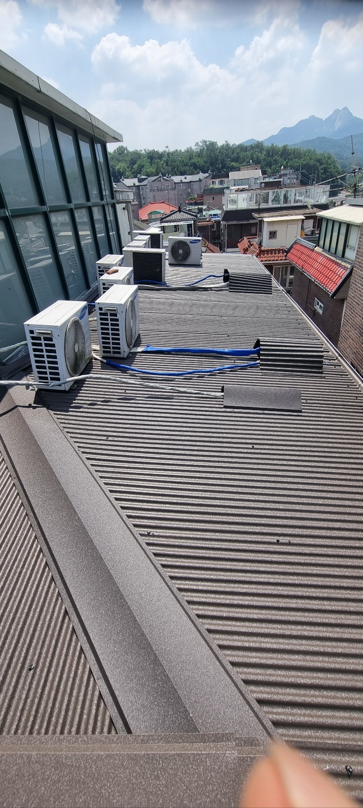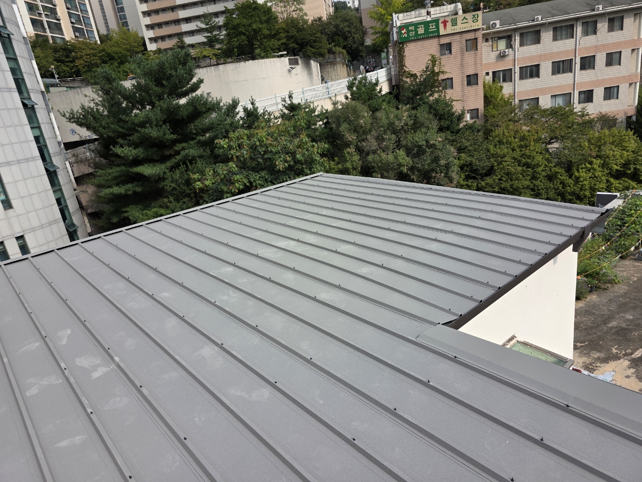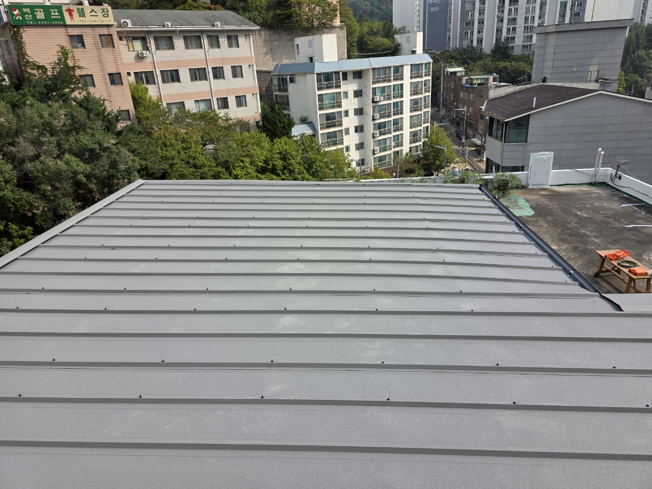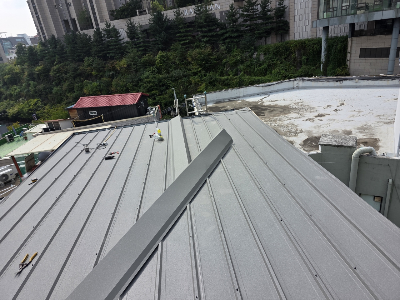 도심지 건물에 찰떡 기존에 많이 시공한 기와형 칼라강판은 구옥 단독주택에 어울리는 지붕자재라 도심지에 고층 건물 밀집지역에 위한 지붕에는 약간 어울지 않는 느낌이 많었습니다.기와형 칼라강판은 고전느낌이 많이나서 단독주택 지붕에 잘어울립니다.징크250칼라강판은 도심지 고층 빌라주택 상가건물등에 잘어울립니다.
