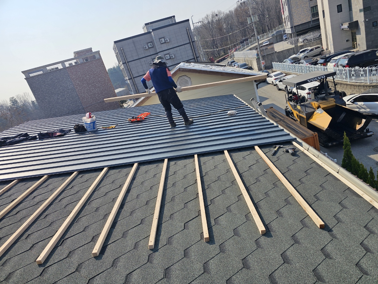 프레임 설치후 강판 시공 위 현장은 아스팔트슁글 지붕위에 목재하지 프레임설치 작업후에 징크250 칼라강판 지붕방수 지붕공사를 진행하는 현장입니다.목재를 설치하고 칼라강판을 시공하면 강풍이 불어도 칼라강판이 간혹 이탈 탈락되는 문제가 발생하지 않습니다.