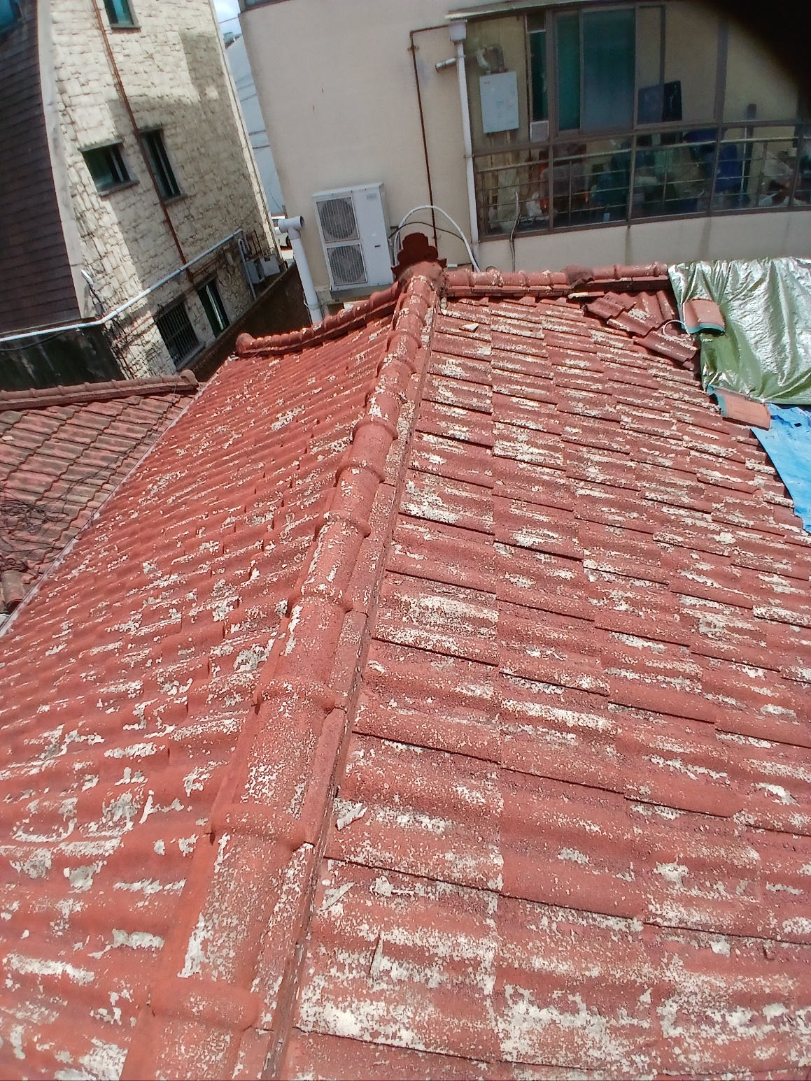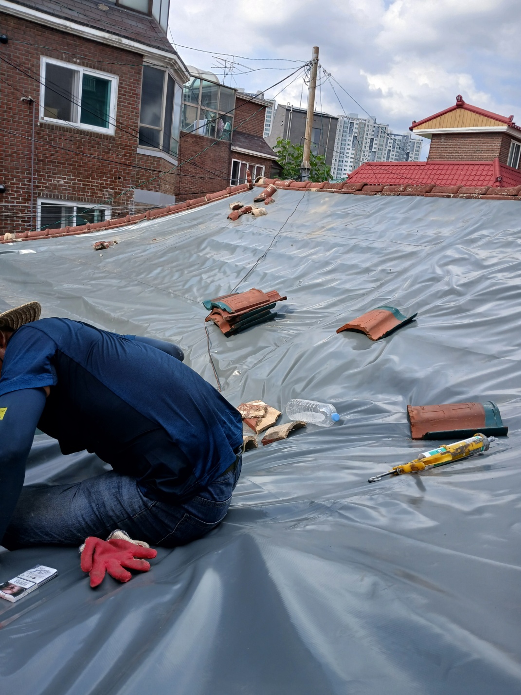 타포린방수포 설치중 견적방문시에 지붕에 올라가 실측하여 공장에서 맞춤 제작한 타포린방수포를 기와가 설치된 지붕위에 덧방시공을 합니다.타포린방수포를 시공하기전 용마루기와는 철거하여 지붕한쪽에 별도 보관한다음 지붕 전체 구역에 타포린방수포가 시공되면 철거한 기와를 재사용하여 추가로 고정하는 작업을 진행합니다.위와같이 지붕방수 지붕공사 작업은 지붕시공에 대한 숙련된 기술자가 시공하여야 완벽하게 비가새지 않는 방수층이 만들어 집니다.