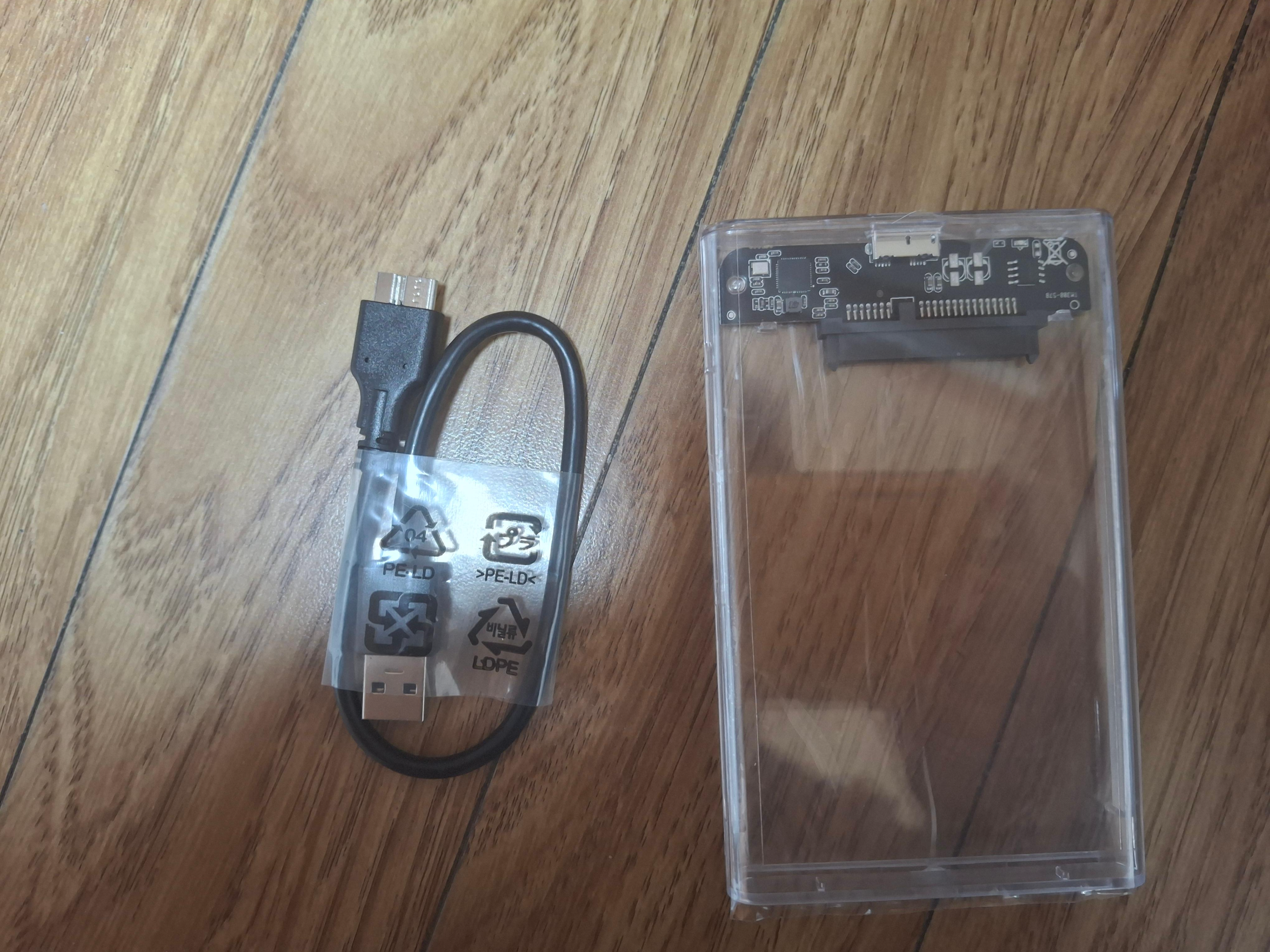 2.5인치 SSD케이스 구매 SSD를 외장용으로 사용하기 위하여 2.5인치 외장케이스를 별도로 구매했읍니다.SSD가 2.5인치 크기이기 때문에 케이스에 집어넣으면 딱 맞게 들어갑니다.전용 USB케이블 포함입니다.