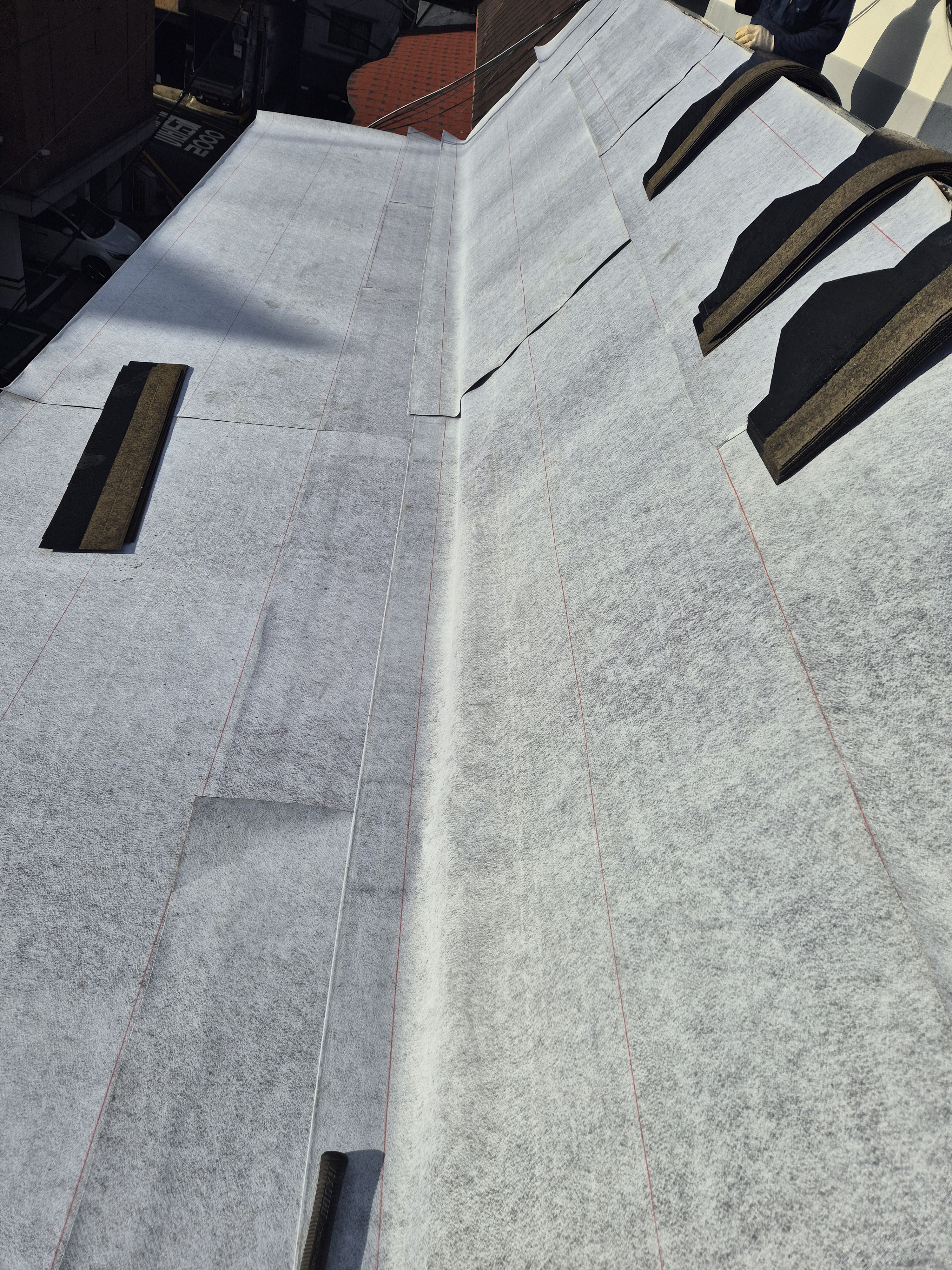 방수시트 겹침 설치 작업 지붕 경사면 방향에 맞게 방수시트를 서로 겸침 시공하여 빗물이 샌드위치판넬 지붕으로 들어가지 못하도록 시공처리 하였습니다.방수시트는 내구성이 튼튼하여 지붕에 시공되면 쉽게 찢어지지 않고 변질 변형 부식 현상도 발생하지 않고 외부충격에 강하여 지붕에 한번 설치되면 수십년간 사용이 가능합니다.