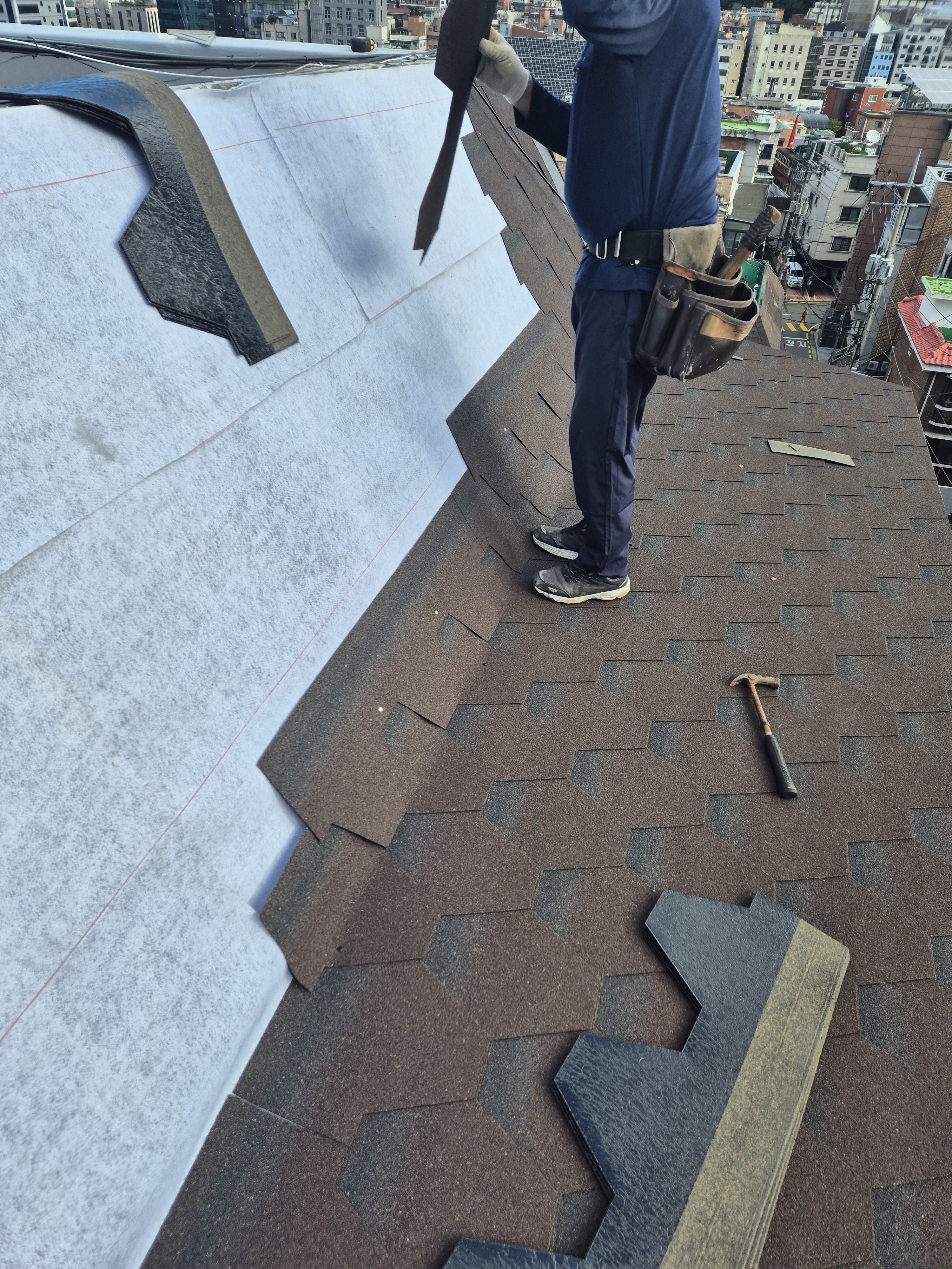 아스팔트슁글 설치 작업 방수시트 설치 지붕방수 지붕공사 작업이 완료되면 육각아스팔트슁글 지붕자재를 사용하여 확장베란다 샌드위치판넬 지붕에 시공을 진행합니다.아스팔트슁글을 한장씩 붙인후 추가 고정 작업을 진행합니다.시공후에 외부 태양열에 몇일 노출되면 지붕바닥면에 강하게 달라붙어 태풍 강풍이 불어도 쉽게 떨어지지 않습니다.