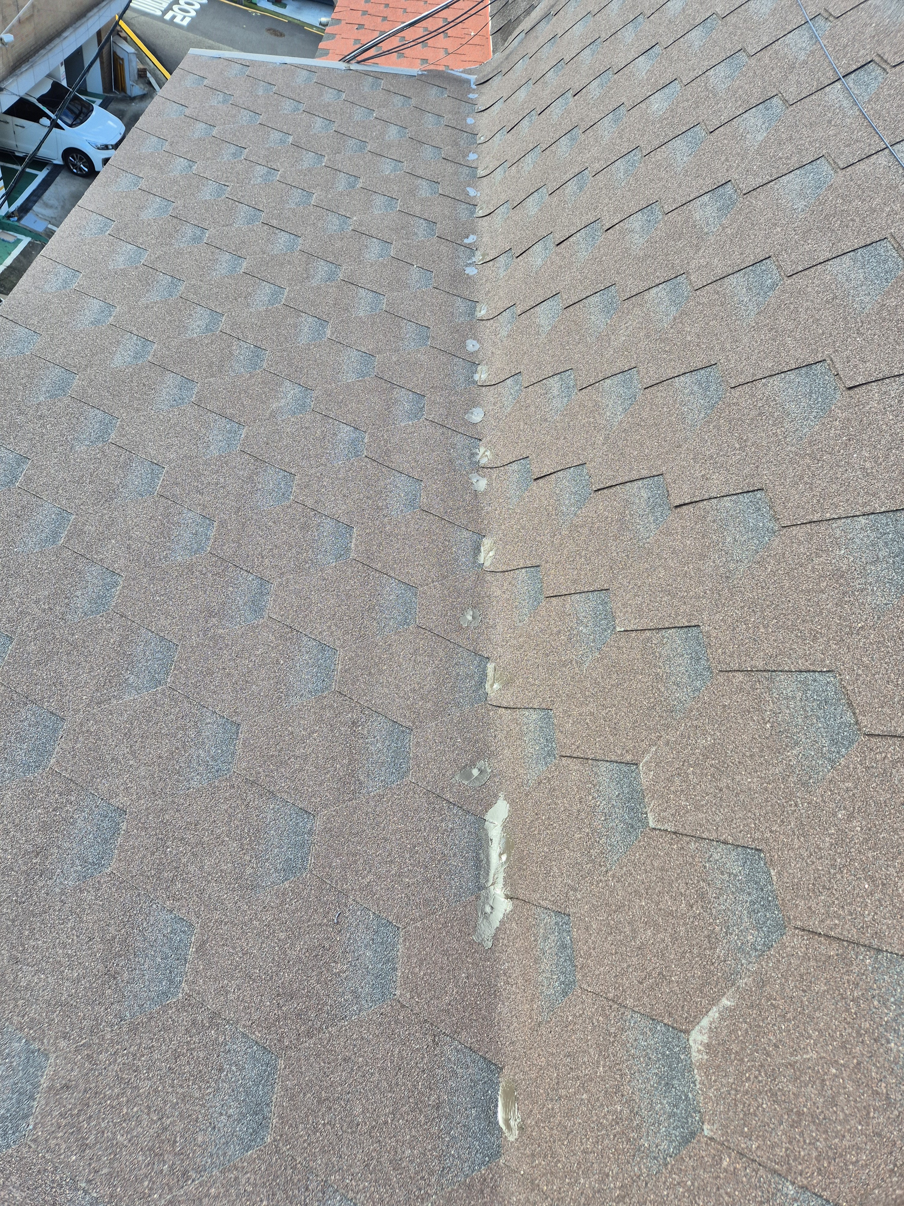 마감카바 시공 위 현장처럼 확장베란다 지붕과 벽면 지붕이 연결되는 빌라 주택 같은경우 꼭 벽면 용마루 카바를 시공하여야 합니다.예산 문제로 제외하고 시공하면 시공후 나중에 빗물침투의 원인이 될수 있습니다.용마루 모양에 크기에 맞게 강판 카바를 맞춤 제작하여 설치 작업을 진행하여 드렸읍니다.이렇게 해서 확장베란다 아스팔트슁글 지붕방수 지붕공사 작업이 완료되었습니다.언제든지 무료상담이 가능하오니 연락주시면 됩니다.감사합니다.