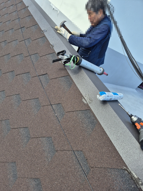 실리콘 마감 아스팔트슁글 고정 마감재가 노출된 부분이나 마감 부분을 꼼꼼하게 점검하여 부족한 부분이 체크되면 실리콘 도포 작업을 진행합니다.실리콘은 정품 제품을 사용하여 작업합니다.가장 오래가고 하자없는 실리콘만을 사용합니다.