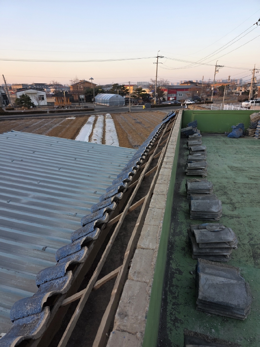 현장정리 이번 경기도 김포시 통진읍 동을산리 주택의 옥상 난간 지붕에 설치되어있던 노후된 시멘트기와를 철거하고 목재하지 프레임설치 지붕공사 작업후에 지붕크기에 맞게 맞춤 제작한 칼라강판을 덮어서 튼튼하게 시공한 결과 지붕자재 이탈 탈락 위험이 감소되었습니다.빗물 스며듬 침투 문제도 완벽하게 예방됩니다.마감 라인 정돈으로 지붕 및 주택 건물 외관이 깔끔하게 개선되었습니다.
