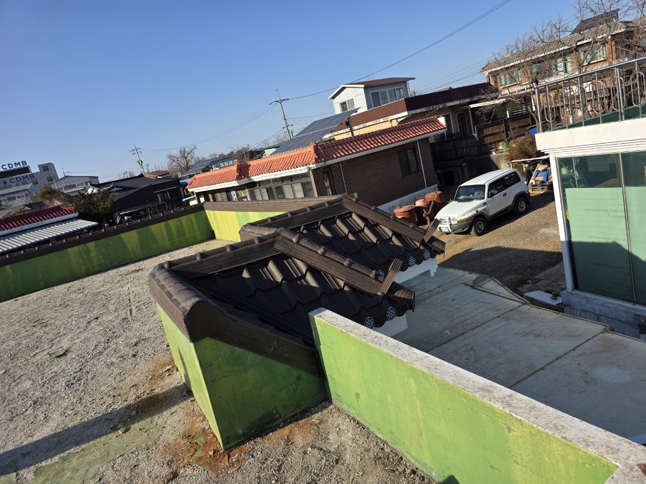 오래된 시멘트기와의 한계 옥상 난간에 설치된 기와는 비만안새면 되는 것으로 끝나는것이 아닙니다.강풍이나 태풍때 기와가 탈락될수 있기 때문에 사용 연식에 따라 수리 보수 또는 전체 시공을 새롭게 하셔야 사고 위험을 완벽하게 차단할수 있습니다.특히 옥상 난간 부위는 외부 바람과 비 눈 태양열을 정면으로 받아내는 위치라 기와가 조금만 이탈되어도 비바람이 틈으로 파고들어 문제를 야기 시킬수 있습니다.