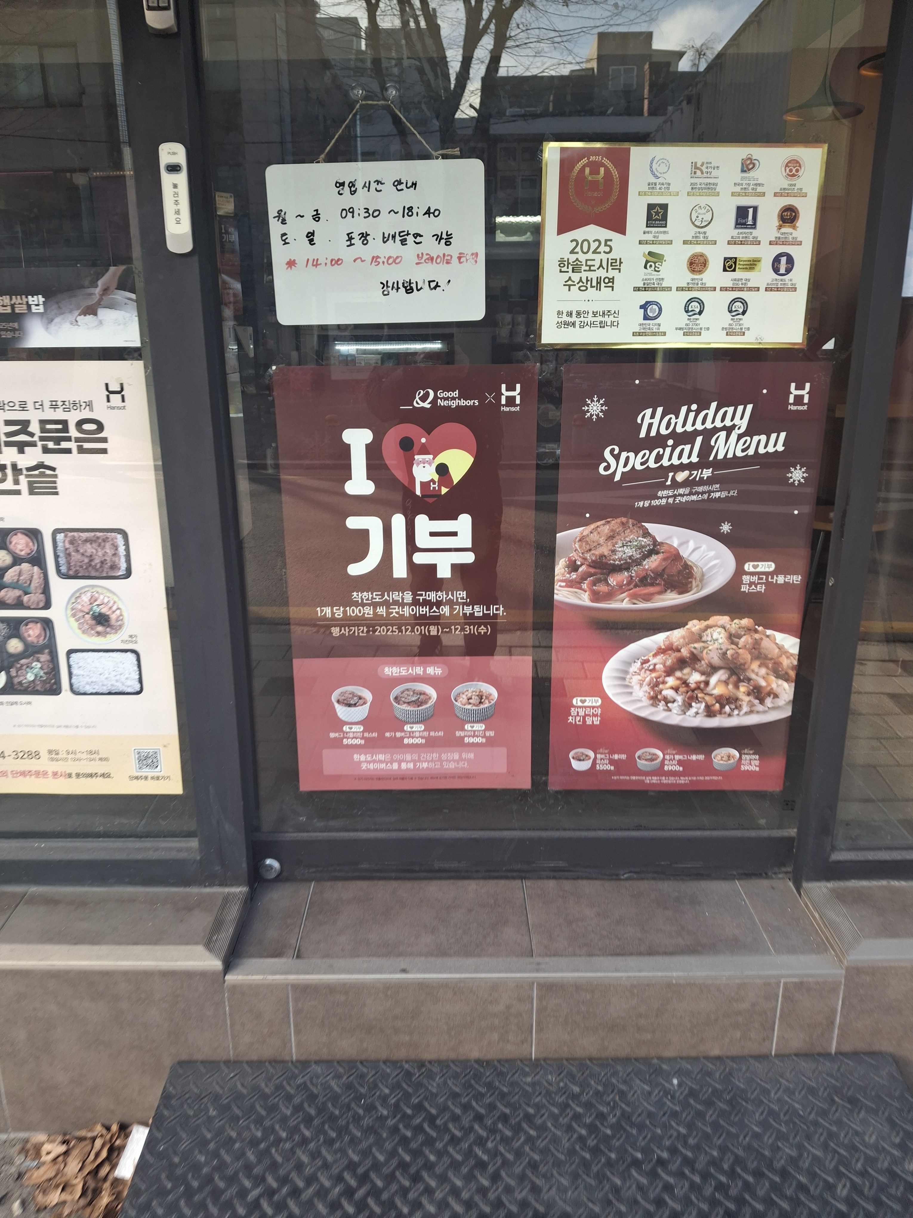 운영안내 이벤트 포스터 매장 유리창에는 매장 운영안내 및 이벤트 내용의 포스터가 붙어져 있어서 주문전에 한번 훑어 보았습니다.운영시간 안내가 따로 적어져 있어서 헛걸음 방지에 아주 도움이 됩니다.기부 캠페인 같은 포스터도 보입니다.시즌메뉴 안내도 있어서 다음 방문할때 먹어볼까 하는 고민도 하게 되는것 같습니다.
